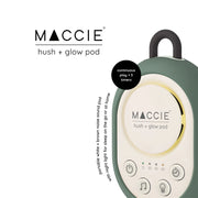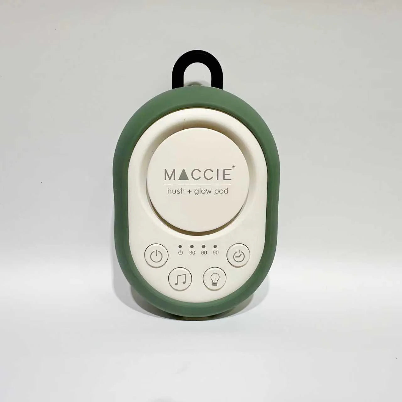 The MACCIE hush + glow pod is a portable white & brown noise sound machine with a dimmable night light designed to help create a peaceful sleeping environment for babies at home or while travelling.