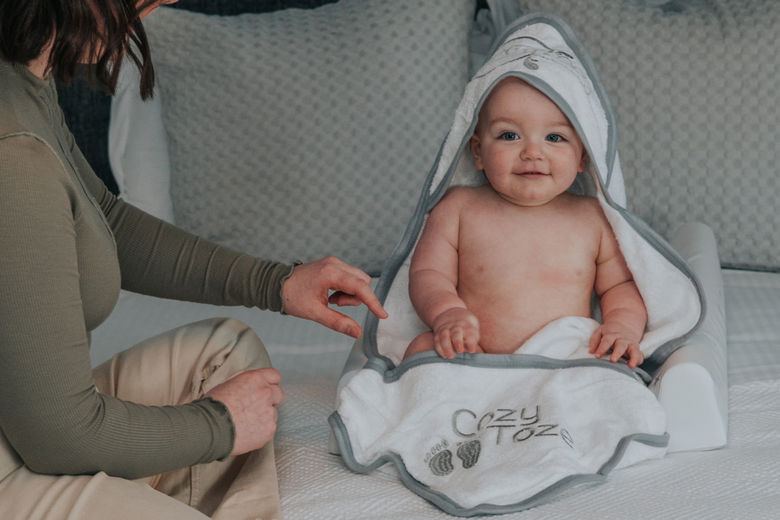 So many towels are soft and warm around baby’s body but what about their cold wriggly little feet? Enter the CozyToze!
