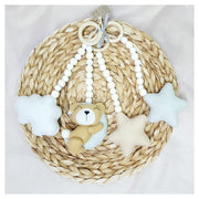 Each dangle features soft felt bear figures and coordinating elements suspended from smooth, uncoated wooden rings and natural beads. The gentle movement and varied textures encourage visual tracking and reaching, helping to develop eye coordination and hand motor skills during playtime.